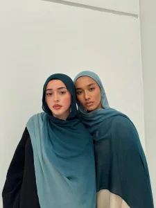 Hijab gradasi teal dengan inspirasi warna laut yang menenangkan. Perpaduan warnanya memberikan kesan calm, elegan, dan modern untuk mempercantik penampilan.