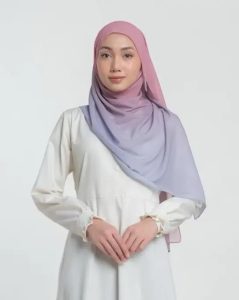 Hijab gradasi pink–lilac yang manis dengan nuansa lembut dan feminin. Kombinasi warnanya memberikan kesan anggun dan fresh, cocok untuk melengkapi gaya yang soft dan elegan.